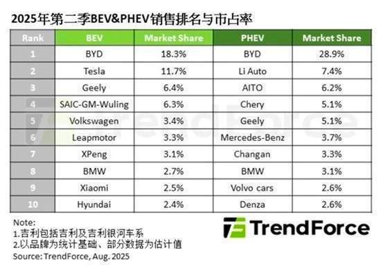2025年第二季度全球新能源汽车市场延续增长态势,根据TrendForce集邦咨询数据,纯电动车销量达328万辆,同比增长39%;插电混合式电动车销量158.7万辆,同比增长15%。两大细分市场竞争格局呈现显著差异,目前中国品牌在头部阵营中均占据主导地位鑫赢智投,而新势力与传统车企的博弈也在持续深化,接下来我们就来看看销量榜前十的车企表现。