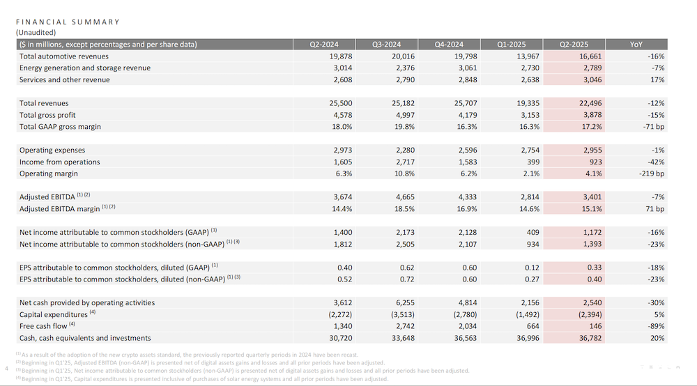 车东西7月24日消息,就在刚刚,特斯拉发布了其2025年第二季度业绩报告,路透社指出,这是特斯拉十多年来最严重的季度销售额下滑。而从今年上半年来看,特斯拉营收、净利润更是双双下滑。